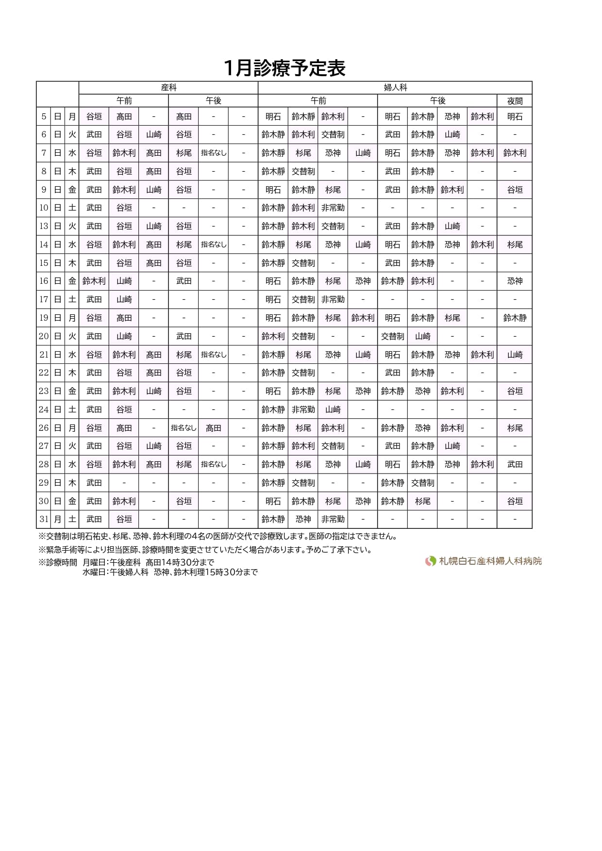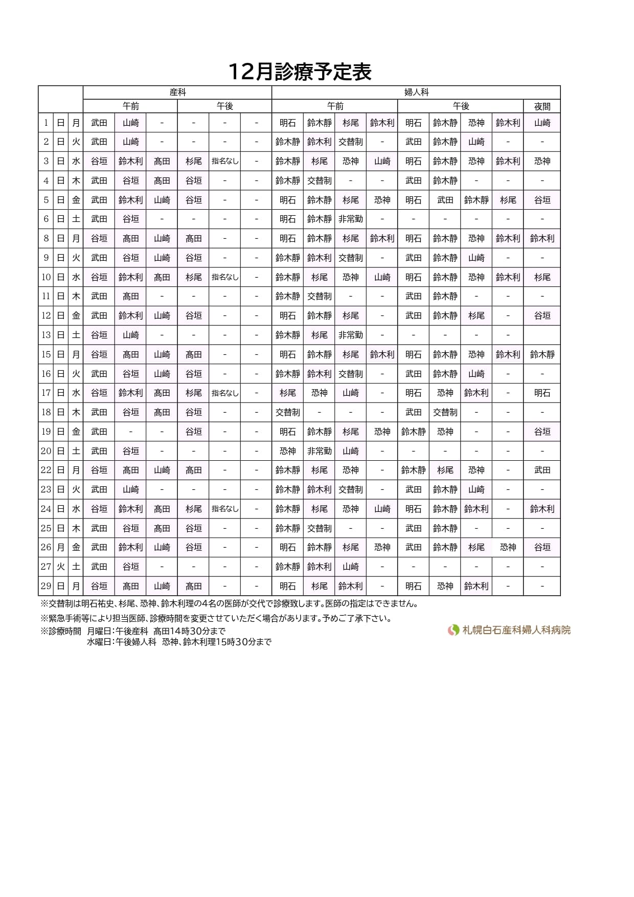 | 9:00~12:30 | ● | ● | ● | ● | ● | ● | 9:30~11:30 |